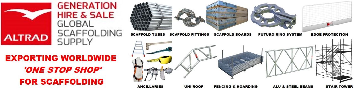 Email export@generationuk.co.uk Global Scaffolding Supply - The largest available UK inventory of scaffolding, access and safety products - Altrad Group - SCAFFOLDING & ACCESS SOLUTIONS - EXPORTING WORLDWIDE - A full service of supply of quality British Standard, compliant scaffolding equipment from traditional Scaffold Tube, Scaffold Fittings, Scaffold Boards/Planks to Modular and Ring System Scaffold - Fittings - Couplers - Tools - - Stair Towers - Stairs