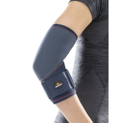 Neoprene elbow support made of closed cell neoprene for adequate body heat conservation. With a removable non-slip pad featuring relief points for selective pressure.