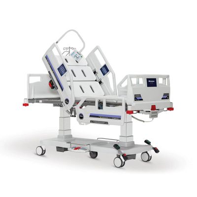 The CURA 5000 is an advanced electric hospital bed designed for intensive care units, featuring a robust column motor construction powered by four, with an optional fifth motor to enhance patient safety, comfort, and hygiene during hospital stays. It adjusts height using high load capacity telescopic columns and supports efficient lateral mobilization with a 5th motor for lateral tilts. Equipped for enhanced patient care, its plastic mattress platform is designed with ventilation channels to improve airflow and comfort, made from recyclable and sanitizable materials like PP with silver nanoparticles. For diagnostics, the bed is X-ray ready, featuring a backrest adapted for X-ray cassette insertion. Safety features include antimicrobial side rails with integrated urine bag holders, ensuring patient safety and caregiver accessibility. With user-friendly control panels including touchscreen and remote options, and additional safety features like an auto-regression system and emergency CPR functionality, the CURA 5000 prioritizes both patient and healthcare staff needs.