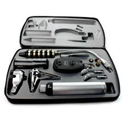 Complete with Standard Otoscope, Standard Ophthalmoscope, Handle, Nasal Speculums, Laryngeal Mirror, Reusable Specula, Hard Case.