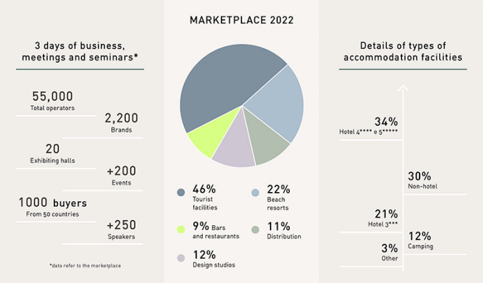 The event is simultaneous to TTG Travel Experience, which involves numerous of operators in tourist facilities and satellite businesses: accommodation facilities, resorts, non-hotel activities and open-air tourism from Italy and the world alongside the major key players in the reference industries.
