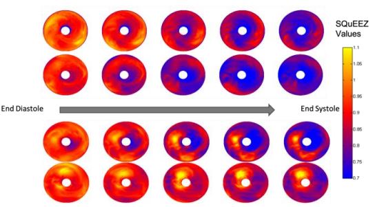 The image at the left displays the left ventricular SQuEEZ “bullseye” maps of two subjects with normal hearts (top) and two patients with infarcted hearts indicating cardiovascular disease. The analysis clearly shows large abnormal yellow areas indicating regions of the endocardial wall that are not moving normally due to the damage. Cardiac CT combined with SQuEEZ analysis software can provide clinicians with a normalized measurement to determine the answer to the first and most important clinical question that a cardiac surgeon needs to know for a patient who presents with Cardiovascular Disease (CVD) symptoms—“Is the contractile function normal or not normal?” SQuEEZ allows the surgeon to make a more informed decision about the proper intervention for the patient, whether it is a drug, surgery or medical device, and then follow the patient’s recovery and progress after the procedure, non-invasively and with extremely low exposure to radiation. The software is an intuitive, quantitative method to classify LV contractile function that has the potential to provide significant improvement in clinical decision-making relative to the inconsistent, qualitative tests used today. The software provides the ability to both quantify and localize left ventricular (LV) contractile dysfunction. This will improve clinical outcomes by addressing limitations of the current nonquantitative metrics of regional LV function. The software creates an objective standard that increases accuracy by reducing the user variability that has plagued interpretation of LV functional analysis. The simplicity of interpreting and displaying these results will increase patients’ understanding of their coronary artery disease.