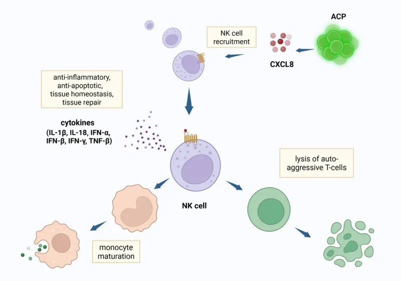 - ACP-01 (VesCell™) produces signals like IL-8, VEGF, and angiogenin. They attract natural killer (NK) cells that suppress inflammation, reduce tissue scarring, and support new blood vessel growth (angiogenesis).