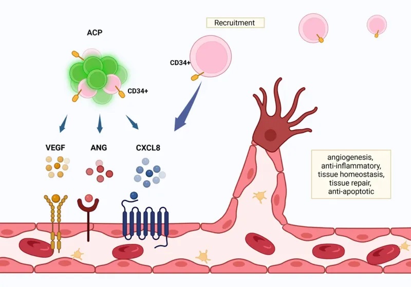 Figure 2. Angiogenic cell precursors (ACPs) potentiate healing through expression of tissue regeneration factors such as the chemokine interleukin-8 (CXCL8), vascular endothelial growth factor (VEGF) and angiogenin. In addition to the robust presence of CD34+ in ACP, the expressed CXCL8 recruits peripheral CD34+ precursor cells, further supporting angiogenesis (Henderson & Tuchman, 2025).
