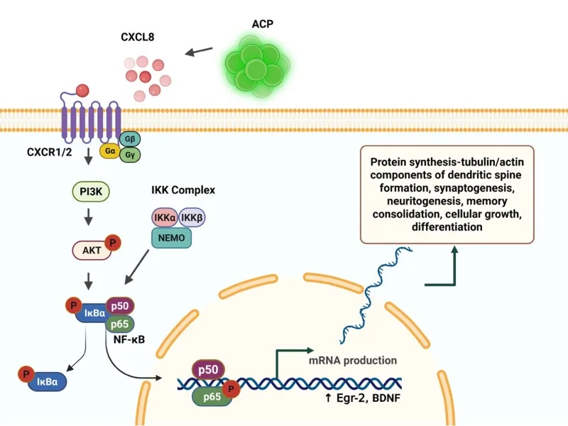 Figure 3. Interleukin-8 (CXCL8) is expressed by angiogenic cell precursors (ACP)s, and activates the canonical NF-κB pathway, resulting in gene transcription and protein synthesis necessary for memory formation and consolidation (Henderson & Tuchman, 2025).