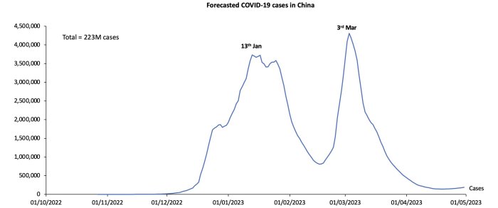 The Airfinity model estimates cases rates could reach 3.7 million a day in a January peak and 4.2 million a day in March 2023.