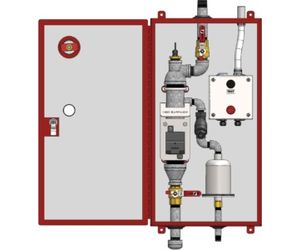 The cabinet features a thermostatically controlled heater and an insulated steel enclosure that maintains internal temperatures above freezing. A float switch monitors condensate levels and provides an alarm signal when the drum drip needs maintenance. Condensate is retained safely inside the heated cabinet until it is manually drained during regular maintenance.