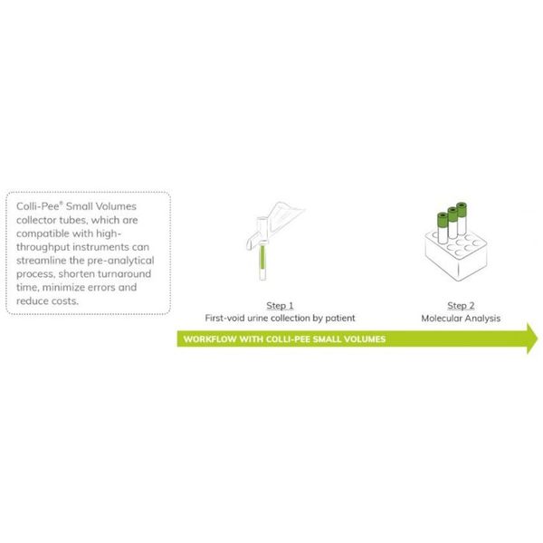 The currently used first-void urine collection device developed by Novosanis, Colli-Pee containing UCM, collects the first fraction of urine in a total volume of 20 mL. Colli-Pee Small Volumes* can allow urine collection of 4 mL and 10 mL.