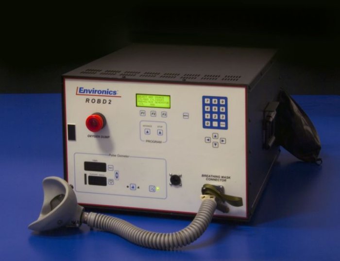 The system uses Thermal Mass Flow Controllers (MFC) to mix breathing air and nitrogen to produce the sea level equivalent atmospheric oxygen contents for altitudes up to 34,000 feet. The MFC`s are calibrated on a primary flow standard traceable to the National Institute of Standards and Technology (NIST). The ROBD 2 introduces pressure changes and gas expansion as a function of altitude. Several safety features are built into the device: prevention of over pressurization of the subject`s mask, prevention of reduced oxygen contents below those being requested for a particular altitude and an emergency dump switch that will supply 100% O2 to subjects. The software is menu driven, simplifying the use of the system for the field operator. Built-in self-tests verify all system component functionality before the operation of the system can begin. If any self-test fails the system will not operate.