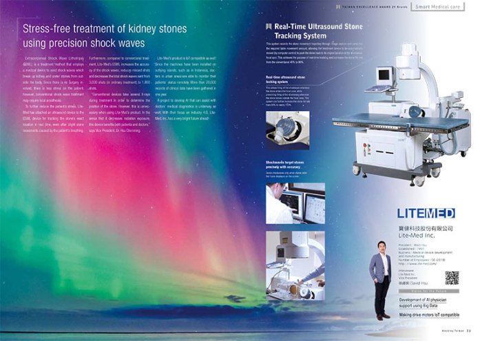 Taiwan’s Industrial Image Publicity Plan promotes Taiwan excellence products in Japanese market. Lite-Med’s extracorporeal shock wave lithotripter, which is a Taiwanese medical product, is honored to be included in this issue of Japanese and English Mook, to promote Taiwanese Excellence award-winning products in Japanese and global market.