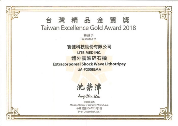 Lite-Med’s ESWL (Model No. LM-9200 ELMA) won 2018 Gold Award, the highest honor of the “Taiwan Excellence Award”.