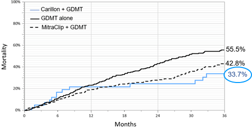 - Three-year mortality rate compared to published outcomes of COAPT and guideline directed medical therapy (GDMT), using matched patient populations, was 33.7% for Carillon, 42.8% for MitraClip in COAPT and 55.5% for GDMT – Figure 1. 2