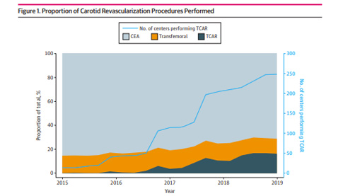The analysis studied 86,027 patients who underwent carotid procedures between 2015 and 2019 using retrospective data from the Vascular Quality Initiative registry, a consortium of more than 400 centers in North America. In total, 7,664 patients (8.9%) underwent TCAR and 78,363 patients (91.1%) underwent CEA. The analysis cited increased use of TCAR, with 15 centers performing both TCAR and CEA at the beginning of the analysis period (2015), increasing to 247 centers at the end of the analysis period (2019), which represents a more than 16-fold increase in centers performing TCAR. The use of TCAR as a percentage of total carotid revascularization procedures also increased, from 90 of 12,276 procedures (0.7%) in 2015 to 2,718 of 15,956 procedures (17.0%) in 2019, which represents a 24-fold increase over 5 years.