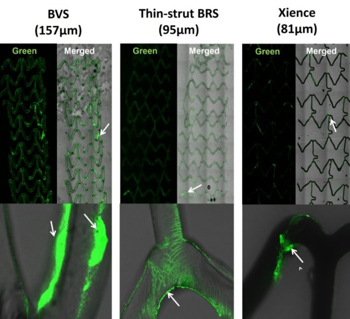 Shengjui, from Nicolas Foin’s group, compared thick strut BRS (157μm, Absorb BVS, Abbott Vascular) to thin strut BRS (95μm, ArterioSorb™, Arterius) and a thin strut DES (81μm, Xience, Abbott Vascular). Scaffolds were expanded in in-vitro coronary perfusion models which were perfused with porcine blood. Thrombus formation was then evaluated.