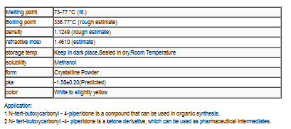 - Other Name: 1-Boc-4-Piperidone; N-tert-Butoxycarbonyl-4-piperidone;