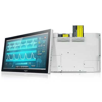 24" Medical Grade Computer, UL60601-certified, designed with 3x hot-swappable batteries for 24/7 runtime. T24B features 6th Gen Intel Core i5/i7, PCAP multi-touch (10 pt), antimicrobial enclosure, WiFi, Bluetooth, TPM 2.0, and VESA mounting. Other features include smart card reader, RFID, and optional battery charging station.