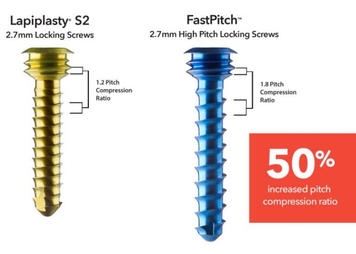 Compression Like a Staple; Stability of a Locking Screw. The sterile-packed titanium FastPitch™ 2.7mm High Pitch Locking Screws are designed with an increased thread pitch ratio between the locking head threads and bone threads, resulting in: Plate Compression: High pitch compression ratio compress the plate to the bone as screws lock in. Faster Insertion: Increased thread pitch results in 33% faster screw insertion. Lapiplasty Compatibility: Locking screws compatible with all Lapiplasty® plating systems.*