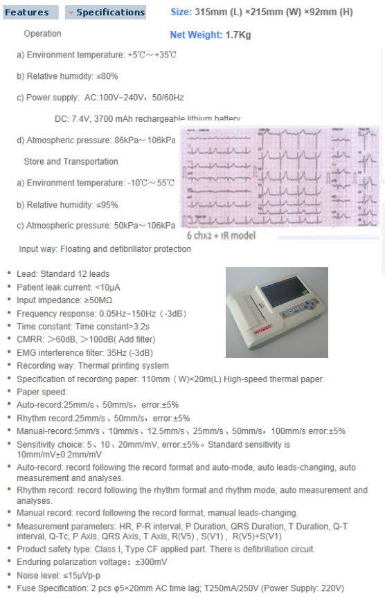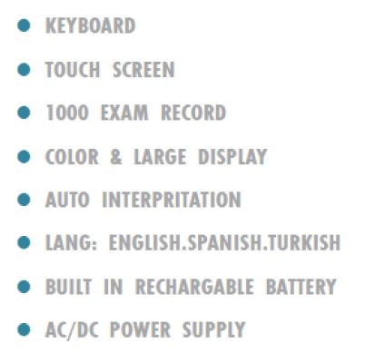 The EKG 6012 is a 3/6-Channel ECG with built in rechargeable battery and 7” Touch screen. It is an easy-to-use medical device especially designed for recording, measurement and interpretation of resting ECGs. The EKG 6012 will be delivered completely with 10 lead patient cable with 4mm banana connector, 6 pcs. chest suction electrodes, 4 pcs. limb electrodes and ground cable. Optional accessories: 10-lead patient cable with snaps for use with disposable ECG electrodes