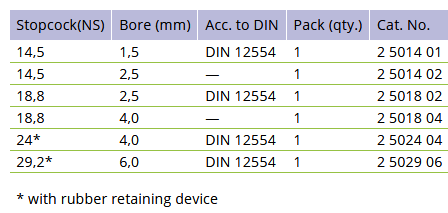 Acc. to DIN 12554 and in addition to DIN standard, T-bore, with solid glass plug and screwthread retaining device, material: borosilicate glass 3.3, leakage rate to DIN 12540-1.