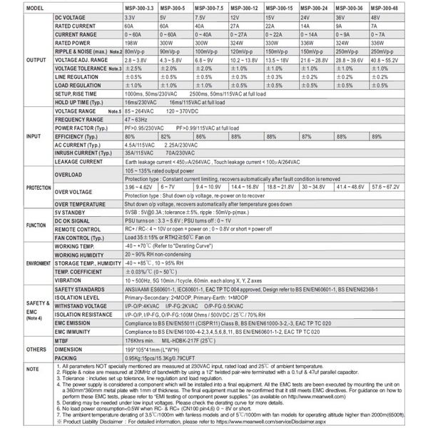 MW - Model MSP-300 Series - 300W Single Output Medical Type Enclosed Switching Power Supply