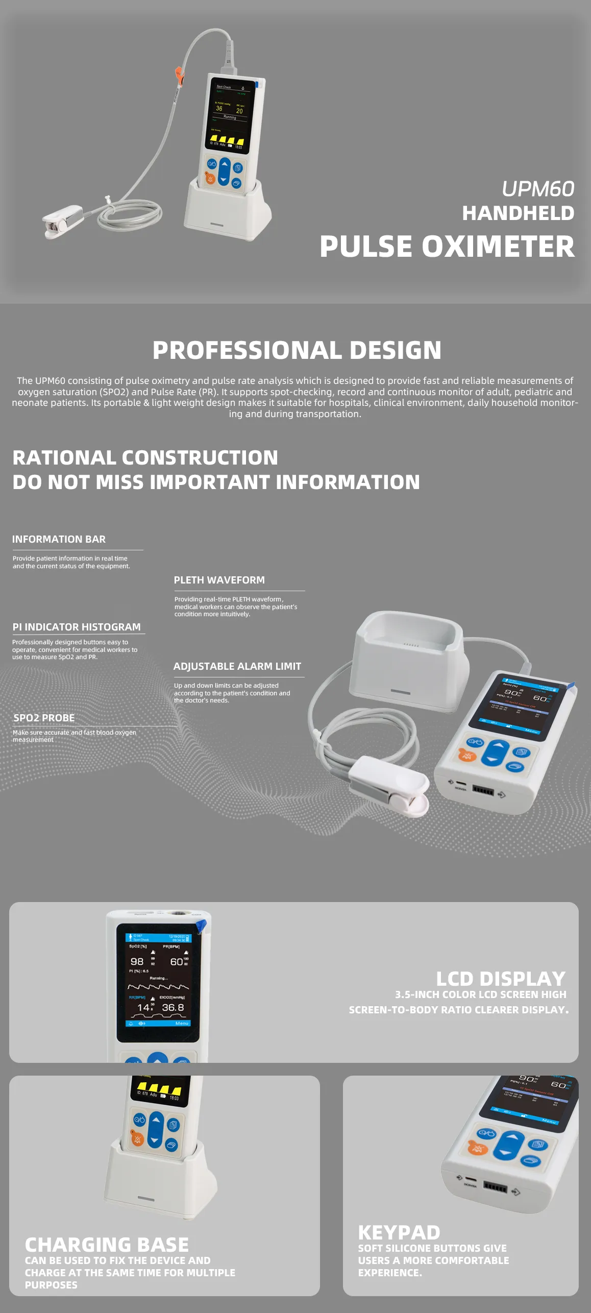 The UPM60 is a Handheld Pulse Oximeter consisting pulse oximetry and pulse rate analysis which is designed to provide fast and reliable measurements of oxygen saturation (SPO2) and Pulse Rate (PR). It is a portable device for spot-checking, monitoring of adult, pediatric and neonate patients. It can be used in the hospital, clinical environment, daily household monitoring and during transportation.