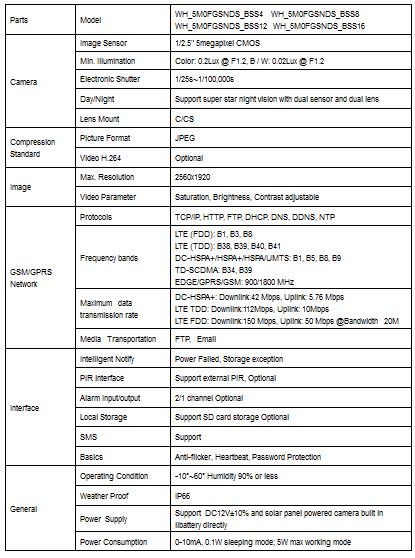 - Camera has Sleeping mode function with Ultra low power, 30W solar panel to powered camera built in Li battery directly