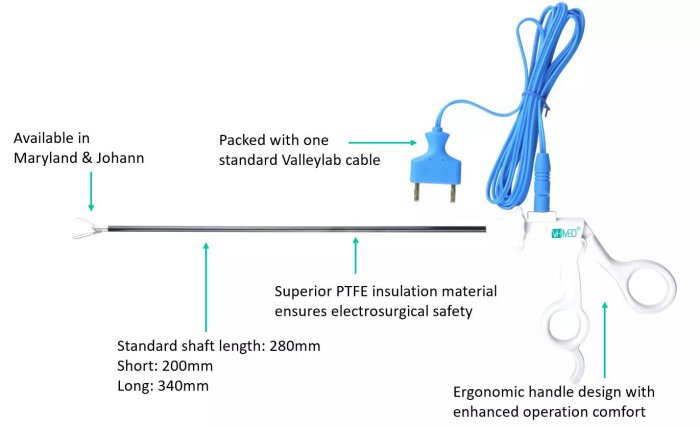 VHMED 3mm laparoscopic bipolar forceps are featured with a pair of instruments jaws securely insulated with high quality, medical grade polymer material with high thermal and energy resistance. The monotype stainless steel material ensures superior electrocautery energy transfer from standard energy source to the tip of the forceps, providing superior grasping forces and outstanding electrocautery performance. The bipolar forceps have a large, smooth rotating wheel and excellent insulation along the shaft. The additional layer of insulation on the electrosurgery connection offers enhanced electrosurgical safety for the operator. VHMED laparoscopic bipolar forceps are your ideal tool for laparoscopic tissue grasping when bipolar modality is in need.