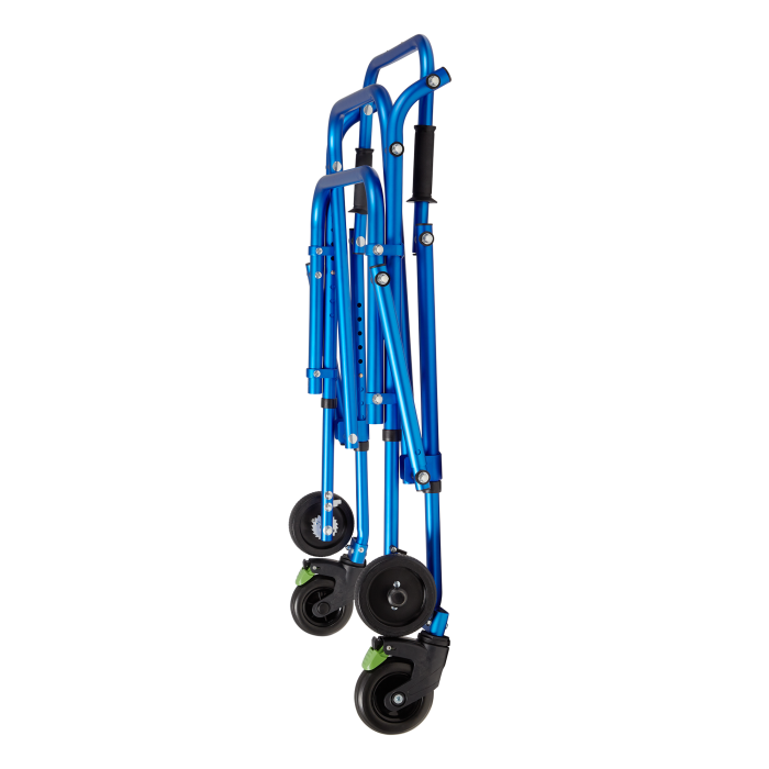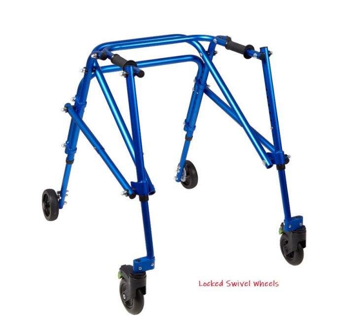 - On/off one-directional rear wheels prevents walker from rolling backwards. Simple to disengage when walking skills improve