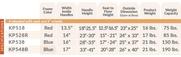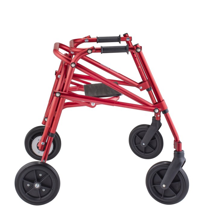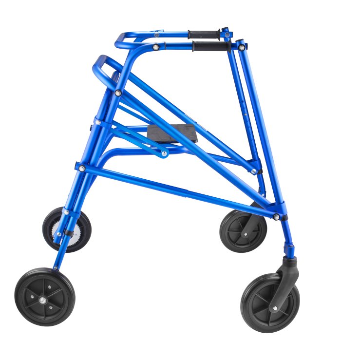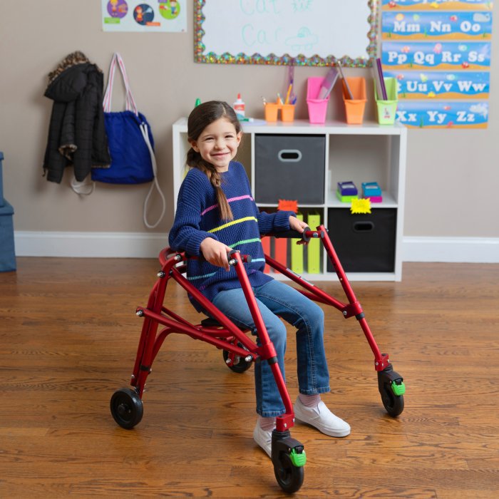 The 4-Wheeled Klip with 8” swivel wheels and flip-up seat is excellent on many fronts. It provides maximum maneuverability and is easy to navigate on all indoor and outdoor surfaces. It is a great convenience for users who may lack the endurance to walk for long periods of time. It is available in four sizes to accommodate toddlers, children, teens and adults and is recommended for those with Cerebral Palsy and other neurological conditions.