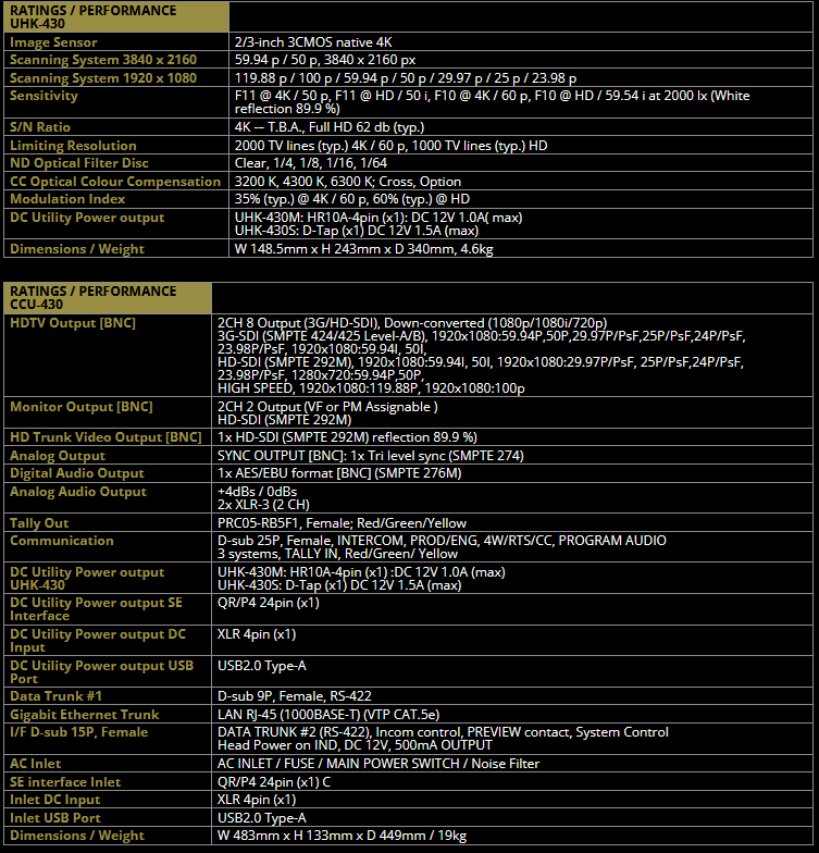 Next to Quad 3G SDI also 12G SDI, Gigabit Ethernet Data Trunk line and Video IP Interfaces are available. The companion Ikegami CCU-430 camera control unit enables easy migration from HD to 4K live production.