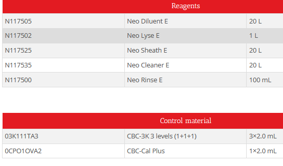 - Parameters WBC, LYM#, MON#, NEU#, EOS#, BAS#, LYM%, MON%, NEU%, EOS%, BAS% , RBC, HGB, HCT, MCV, MCH, MCHC, RDW-SD, RDW-CV, PLT, MPV, PDW, PCT, P-LCR, P-LCC