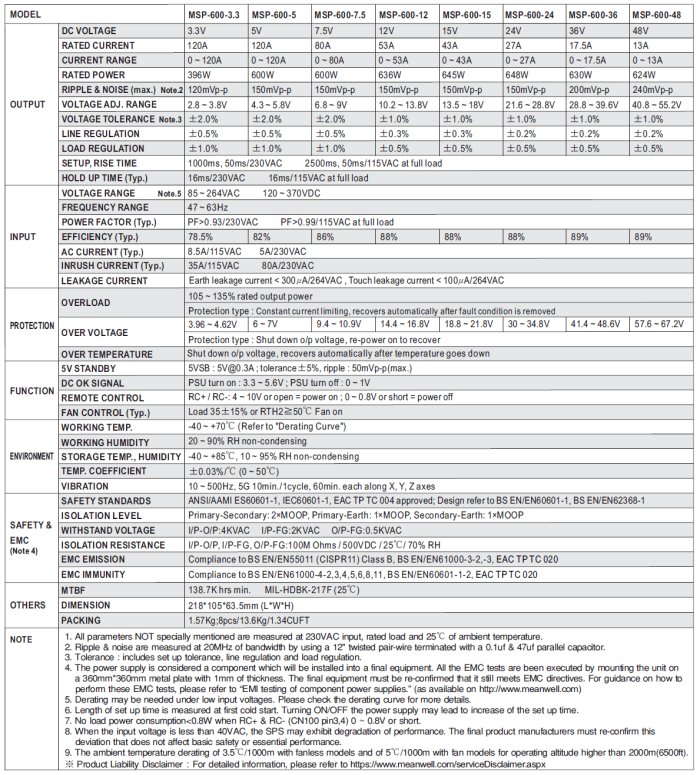 Universal AC input / Full range, Built-in active PFC function, PF>0.94, High efficiency up to 89%, Withstand 300VAC surge input for 5 seconds, Protections: Short circuit / Overload / Over voltage / Over temperature, Medical safety approved (MOOP level), Built-in cooling fan ON-OFF control, Built-in DC OK signal, Built-in remote ON-OFF control, Standby 5V@0.3A, Built-in remote sense function, No load power consumptions.8W (Note.7), Current sharing up to 2400W (3+1) (24V,36V,48V), 5 years warranty.