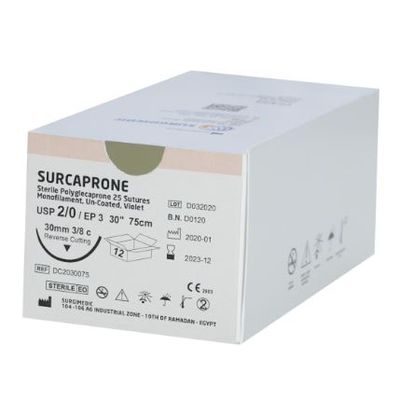 SURCAPRONE is an absorbable surgical suture made from Polyglecaprone 25, a copolymer consisting of 75% Glycolide and 25% Є-caprolactone. This monofilament suture exhibits minimal tissue reaction and its hydrolytic breakdown ensures complete absorption within 90 to 120 days. It retains around 30% of its initial tensile strength by the second week and approximately 60% after one week. Designed for superficial soft tissue approximation, it is suitable for use in general surgery, skin closure, gastrointestinal surgery, plastic surgery, gynecology, and urology. However, it is not recommended for cardiovascular, ophthalmic, or neurosurgery where longer wound support is essential. It is available in USP sizes 6/0 through 2 with optional needle packaging in one dozen or three dozen suture boxes. This specialized suture is directed towards addressing specific surgical needs by providing optimal material characteristics to ensure efficient and safe healing.Most popular related searches