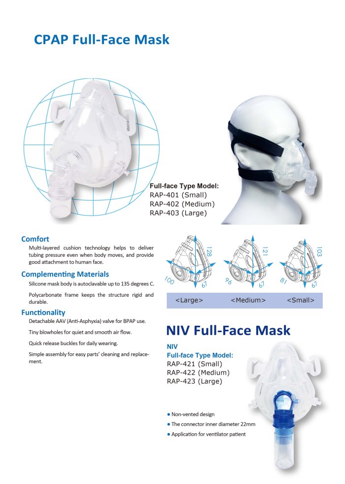 ACARE CPAP full-face mask features patented multi-layered cushion technology providing high compatibility and low noise level when used with CPAP machine.