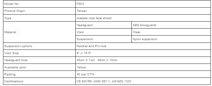 Clear PC chemical resistant visor for protection. Visor available in 8"X15". ABS browguard. Adjustable pinlock suspension with ratchet. One pieces wraparound, wide view & side protection. Quick lock clips for quick and easy visor exchange. CE EN166 & ANSI Z87.1,AS/NZS 1337. OEM packaging & private labelling available. Made in Taiwan.