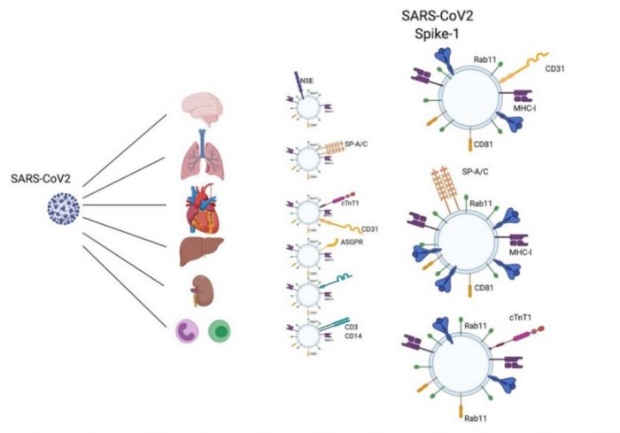Legend: Schematic presentation of the approach: SARS-CoV-2 infected various organs (left), which released exosomes with specific cell surface markers. Simultaneous detection of SARS-CoV-2 on exosomes and organ-specific markers will enable to identify the infected organs during Covid-19 disease (right).