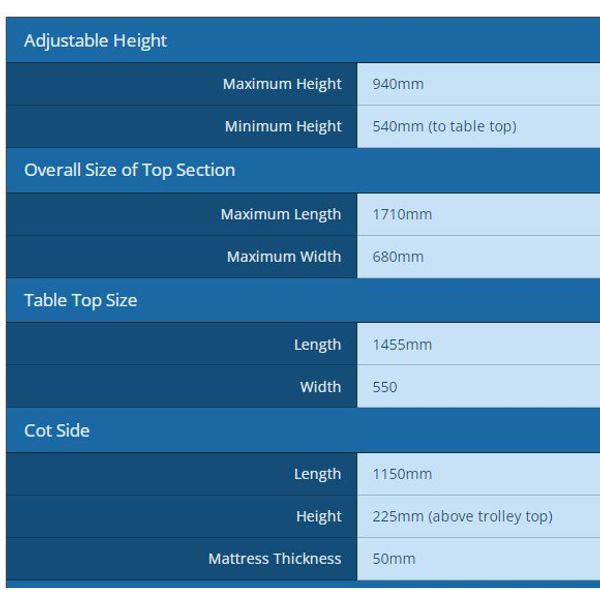 The Paediatric Trolley has the same design features as our popular adjustable height adult trolley. The cot sides drop down and are fitted with protective buffers for patient safety. Maximum heights given are a guide. Dimensions outside of this range can be accommodated.