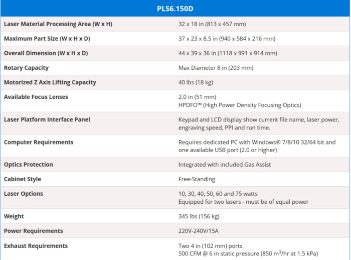 The PLS6.150D is a free-standing platform with a materials processing envelope of 32" x 18" x 8.5" or 4,896 in3 (813 x 457 x 216 mm or 80,253 cm3) that supports dual lasers. As a dual laser platform, the PLS6.150 can support up to two 10.6um C02 lasers with a power range of 10 watts to 150 watts. Additionally, it can support a single 9.3um C02 of 30, 50 or 75 watts, (if a 9.3um C02 laser is installed, only one 10.6pm C02 of up to 75 watts may be installed at the same time.)