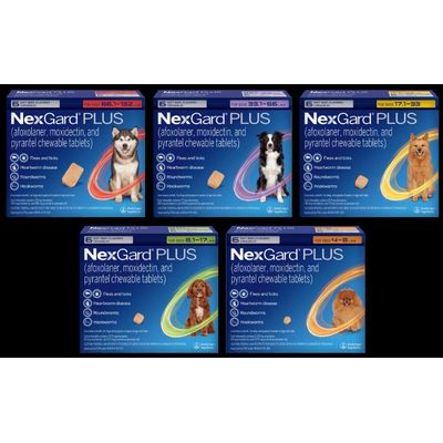 IMPORTANT SAFETY INFORMATION: NexGard PLUS (afoxolaner, moxidectin, and pyrantel chewable tablets) is for use in dogs only. The most frequently reported adverse reactions reported in clinical trials were diarrhea, vomiting, lethargy, and itching. NexGard PLUS contains afoxolaner, a member of the isoxazoline class, which has been associated with neurologic adverse reactions including tremors, ataxia, and seizures in dogs with or without a history of seizures. Use with caution in dogs with a history of seizures or neurological disorders. The safe use of NexGard PLUS has not been evaluated in breeding, pregnant, or lactating dogs. Dogs should be tested for existing heartworm infection prior to starting a heartworm disease preventive. For heartworm disease prevention, give once monthly for at least 6 months after last exposure to mosquitoes.