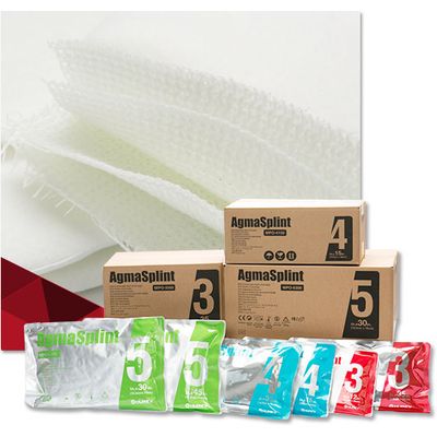 AgmaSpLint can protect the damaged muscle through overlaped and reinforced glass fiber and it adds to new characteristics -bacteriostatic and deodorant properties. Advantages: Bacteriostatic And Deodorant Effects, Variously Classified Products - One-Step & Roll Type : 12 Kinds, Strong Weight Bearing - It can prevent from twisting in long-leg treatment., Feeling Comfortable - It will give you feeling comfortable by adopting high-quality non-woven fabric, Good Appearance, Easy Application, Light Weight, Economical. Application: Choose the proper size product to the patient, Open the product, In case of the roll product, cut the roll product with scissors properly. Dip the product in water for 3 or 5 seconds and squeeze water 3 of 4 times from the product. Put the squeezed product on the towel and press the product in order to eliminate the remainder of water. Put the product site and roll the product with elastic bandage.
