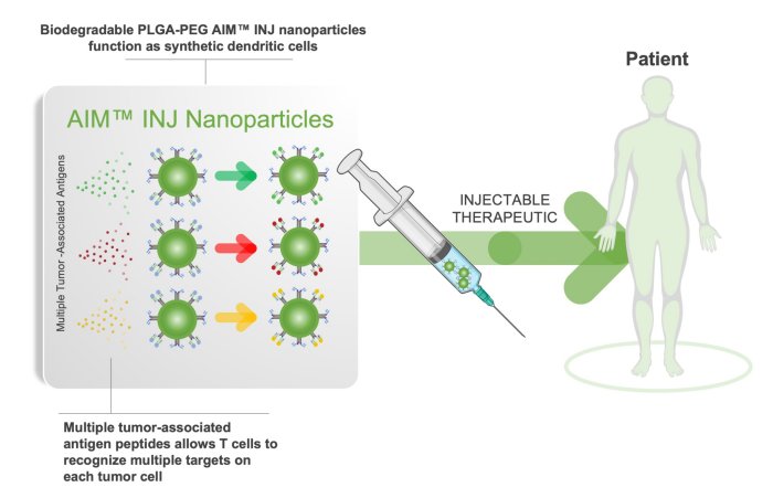 The injectable modality (AIM INJ) is an injectable pharmaceutical product of AIM nanoparticles decorated with antigen-specific peptides and co-stimulatory molecules appropriate for the disease being targeted. Based on specific size and bio-distribution characteristics, the AIM™ nanoparticles have the ability to engage antigen-specific T cell populations at multiple sites in the body (lymph node, lymphatic system, peripheral blood, spleen, tumor).