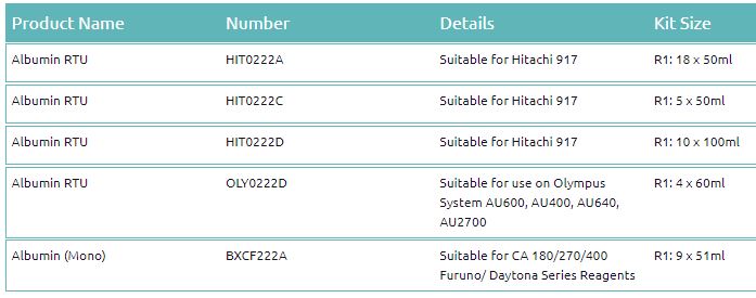 Albumin has two main functions: to maintain water balance in serum & plasma, and to transport a variety of ligands, for example calcium, bilirubin and hormones. Levels below the normal range (hypoalbuminaemia) are the most clinically significant associated with conditions such as malnutrition, liver disease, kidney disease and intestinal disease. Levels above the normal range (hyperalbuminaemia) have little diagnostic significance although they may be an indication of dehydration. Fortress Diagnostics manufactures Albumin kits designed for use on; Hitachi 917 systems, Olympus systems AU600. AU400, AU640, AU2700 and CA 180/270/400 Furuno/Daytona systems.