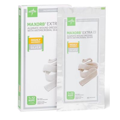 Maxorb Extra Ag+ CMC / Alginate Dressings, 1" x 12" Flat Rope, in Educational Packaging. Calcium alginate and CMC dressings with antimicrobial silver are ideal for moderately to heavily draining partial- and full-thickness wounds. Controlled-release ionic silver helps manage bacteria. Up to 21 days of antimicrobial protection. Learn more about the Maxorb Extra Ag+ CMC and Alginate Dressing.