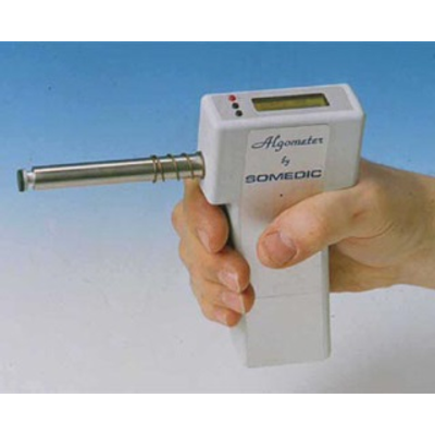 A handy aid in diagnosis and follow up of pain in muscles and tendons. Independent studies indicate the importance of objective, quantitative, methods to evaluate pain sensibility in patients with fibromyalgia, tension headache and other muscle related problems. Using the ALGOMETER, the effects of physiotherapy, pharmacological treatments and other interventions can be followed and documented for clinical as well as research purposes. For the patient, the objective measurements give reassurance, confirming their improvement. For the pharmacological study, the quantitative measurement gives the required precision to properly determine and minimize sample size, while providing accurate data.