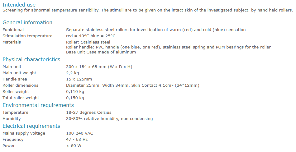 For quick and easy screening of normal temperature perception. Rolltemp is designed for quick screening of temperature sensibility over large body areas. It uses two rollers on handles, one roller being warm and the other cold. Base units, where the rollers are placed in between investigations, charge the rollers with thermal energy to their predetermined temperature levels, 25 °C and 40 °C. With a normal skin temperature of 32 °C this corresponds to a temperature difference of -7 °C and +8 °C respectively. These temperatures are selected as relevant for screening between normal and abnormal temperature sensibility. In normal use, the roller is removed from the base unit and rolled over the skin of the patient. The patient then determines the corresponding sensation and areas with normal/abnormal sensibility can rapidly be mapped out.