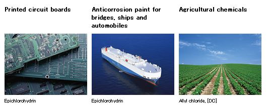Allyl chloride and epichlorohydrin are manufactured through the chlorination of propylene. Allyl chloride is used in allylic compounds and many other chemical products and synthetic resins. It is also using for the basic ingredient of epichlorohydrin. Epichlorohydrin is used mainly as the basic ingredient of epoxy resins which are necessary to Japan`s strategic automobiles and electronics devices. It is also used in many other fields including construction and infrastructure development. We also manufacture original highly functional chemical products from allyl chloride and epichlorohydrin.