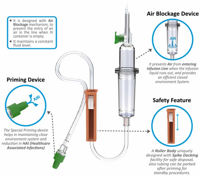 Infusion Giving Set with Air-Blockage and auto priming device. DEHP Free Tubing.