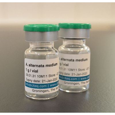 The freeze dried medium can be used for detection of IgE antibody in serum. The purity of the medium contains the highest amount of Alt a 1, the major allergen of Alternaria alternata. Citeq produces moulds with shaking incubation. The product is the result of filtration of the mycelium and spores. This filtrated medium is concentrated, dialysed and freeze-dried. With this method the freeze dried medium contains only products produced by the moulds. It contains no medium and no spores. Due to concentration and dialysis there is a high amount of proteins in the product available.