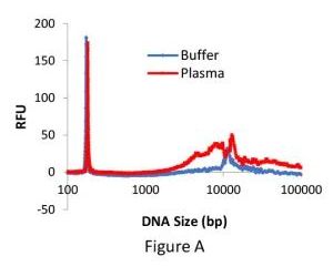 While the 170 bp peak was recovered similarly in each matrix, much more genomic DNA was extracted from the plasma than from the TE buffer resulting in a more patient-like matrix.