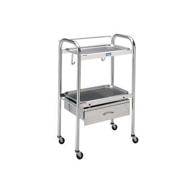 Two removable stainless steel trays. Towel bar and two mask hooks. All welded and polished stainless steel construction. 2" double ball bearing swivel casters. Ideal cart for storage of instruments, gloves, sutures, etc.